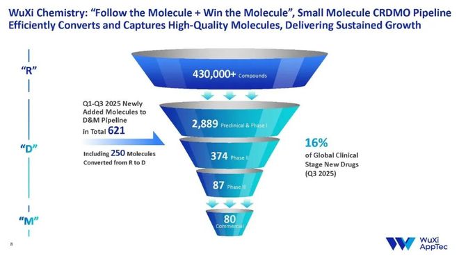 从转化效率看,优质管线在“漏斗”里层层转化。2025年前三季度,D&M管线个分子来自“R”阶段。由于CRDMO模型中RDM的持续转化,管线种已商业化药物中的大多数都是内部转化的结果。