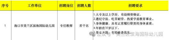 根据幼儿园实际情况需要,海南美贤人力资源管理服务有限公司现面向社会公开招聘以下人员,现公布招聘公告如下: